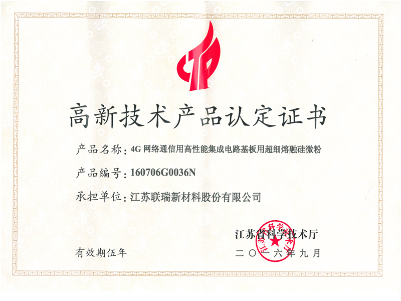 聯(lián)瑞新材研發(fā)的新產(chǎn)品通過江蘇省高新技術(shù)產(chǎn)品認定